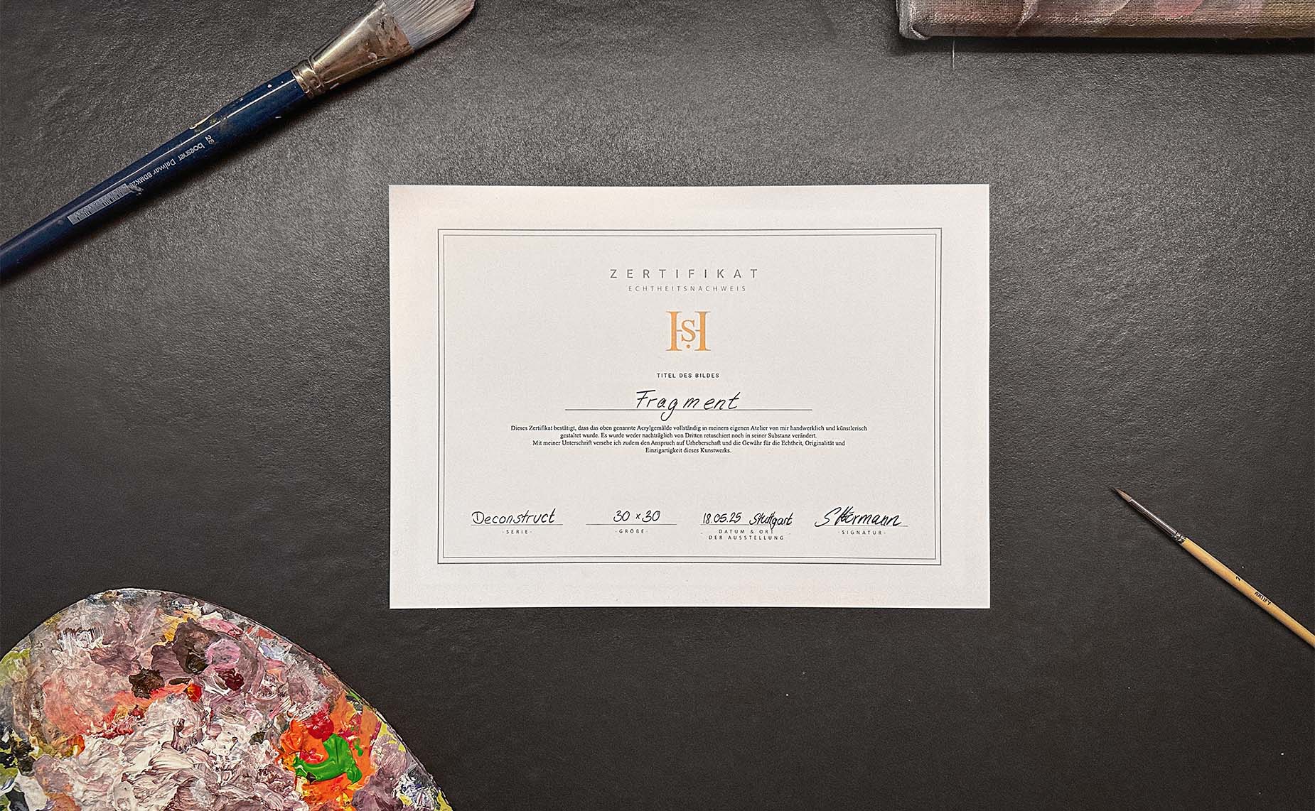 Um dies zu unterstreichen, erhältst du zu jedem Kunstwerk ein von mir handsigniertes Zertifikat, welches die Authentizität bestätigt.